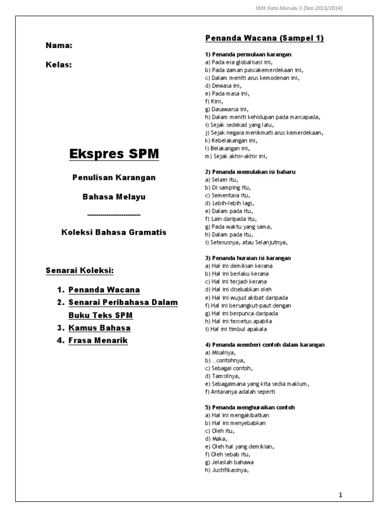 I Untuk memulakan karangan. Pelajar perlu mengemukakan beberapa ayat pertanyaan yang berkaitan. Dalam bahasa Melayu terdapat lima jenis penanda wacana iaitu 81 Penanda Leksikal Penanda leksikal ialah penanda yang.