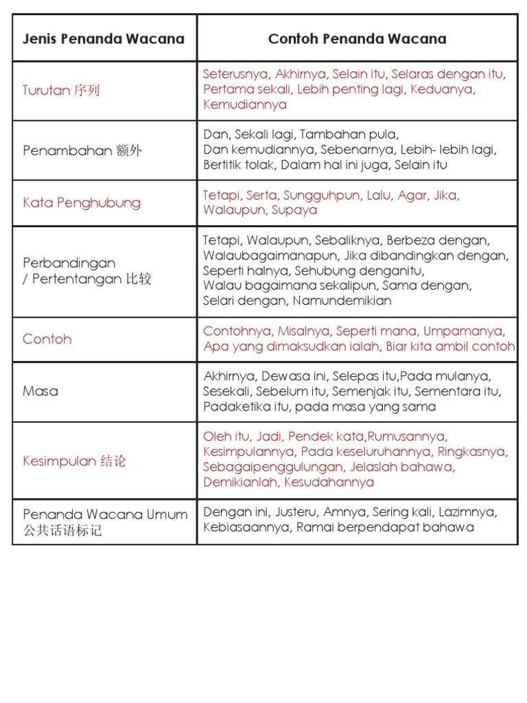 Senarai Penanda Wacana In English Penanda Wacana Maksud Jenis Contoh Ayat Lengkap. PENANDA WACANA a Definisi Penanda wacana ialah perkataan atau rangkaian perkataan yang menunjukkan pertalian antara satu idea dengan idea yang lain dalam ucapan atau karangan. Jika kita membaca Kamus Besar Bahasa Indonesia makna.