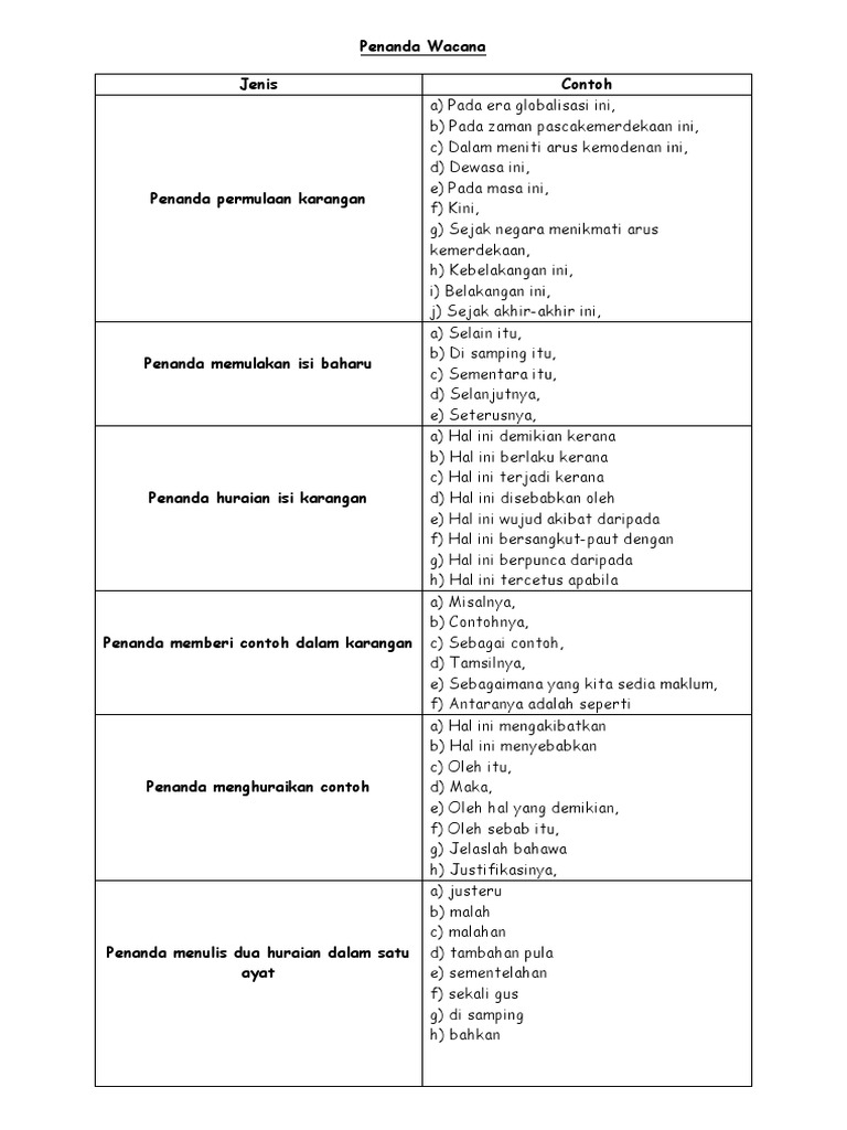 Jenis-Jenis Penanda Wacana 3. 7252019 jenis-jenis penanda wacana 118tajuk 3jenis-jenis penandawacanadisediakan oleh. Jenis-jenis dan contoh penanda waca yang biasa digunakan adalah seperti berikut.